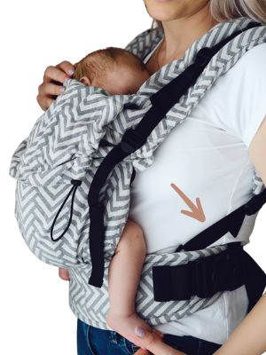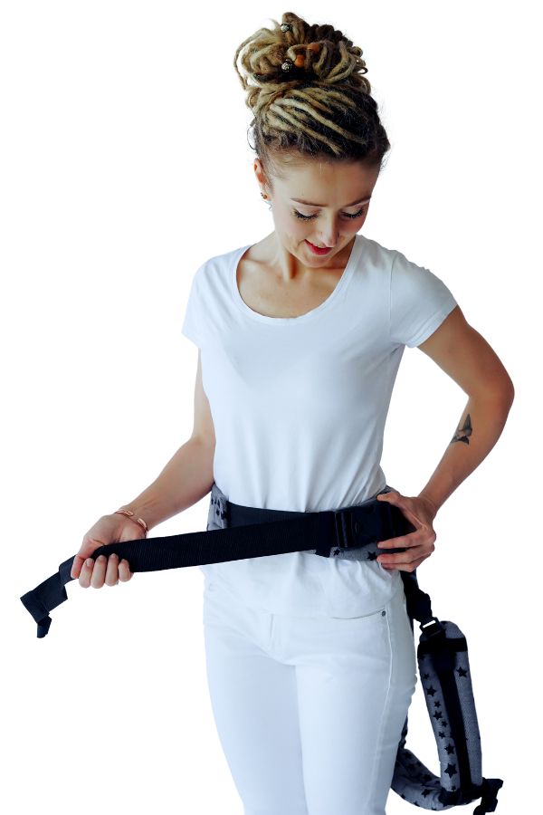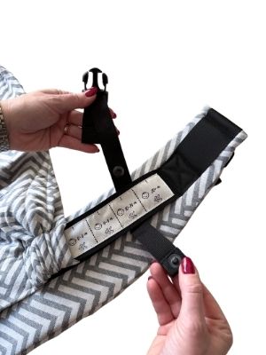 - Chwyć nosidło za pas i umieść je na wysokości talii. Przy mniejszym dziecku pas umieść ponad talią (główka na wysokości „buziaka w czółko”), przy większym – nieco niżej, na biodrze.