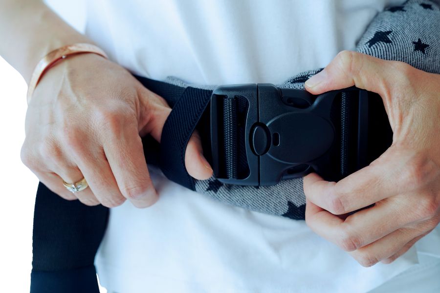 - Nigdy nie odpinaj pasa biodrowego, kiedy dziecko jest w nosidle.