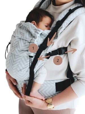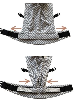 ![]() | 1) Dopasuj szerokość panelu: Szerokość panelu powinna być dopasowana do rozmiaru maluszka, tak, aby sięgał od jednego dołka kolanowego do drugiego (ważne szczególnie przy mniejszych dzieciach). Regulacja znajduje się na pasie biodrowym. |