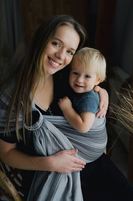 Une écharpe à anneaux en taille M (d’environ 2 mètres de long) est une solution rapide et facile, idéale lorsque vous avez besoin d’une « solution de secours » et que vous vous demandez comment porter rapidement votre bébé. Grâce à ses deux anneaux solides, son installation se fait en un clin d'œil : il suffit de passer le tissu à travers les anneaux puis de tirer pour ajuster l’écharpe à votre morphologie.