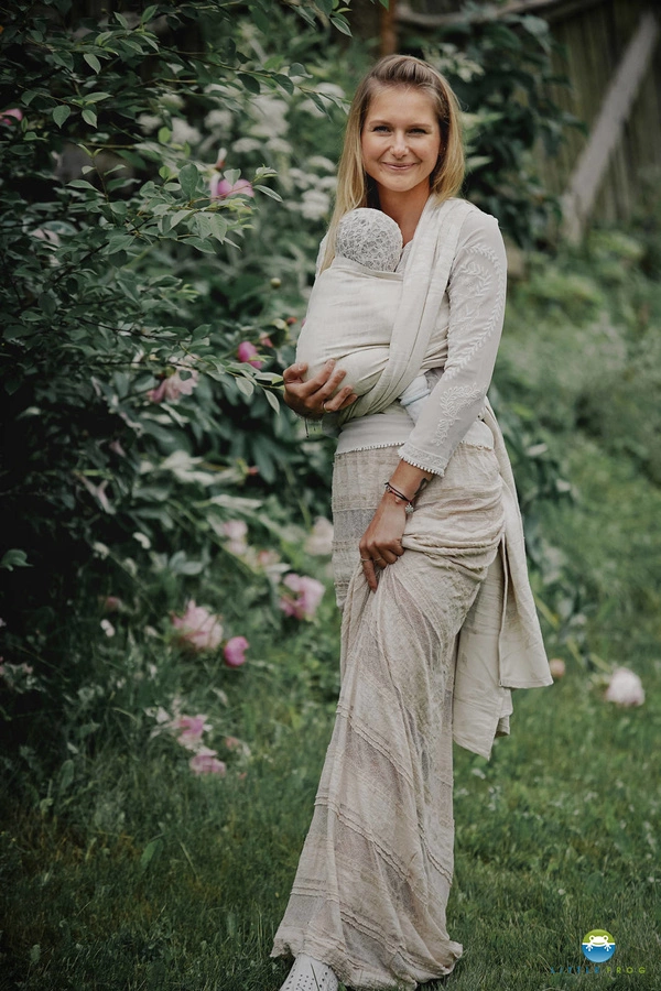 Das Linen Summer Meadow Tragetuch ist perfekt für die gesamte Tragezeit, sei es für Neugeborene oder Kleinkinder. Der Stoff ist vom ersten Gebrauch an weich, und die Kombination aus Weiß und Beige verleiht dem Babytragetuch einen zarten, eleganten Look, der durch die subtile Textur des Leinengarns noch unterstrichen wird.