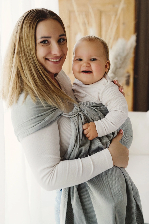 • Der Beige Moonstone Ringsling aus 100% Baumwolle mit Kreuzköpergewebe. Sanftes Gray, minimalistisches Design, weiche und elastische Eigenschaften bieten Komfort beim täglichen Tragen des Babys.