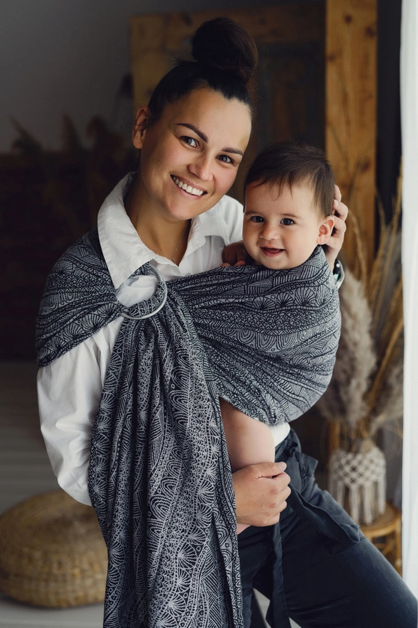TAGS: babywearing, corredino neonato, regalo neonato, regalo per la festa del bambino, nero fascia ad anelli, jacquard fascia ad anelli, fascia bambino ad anelli, trama jacquard, fascia ad anelli primera, marsupio per neonati