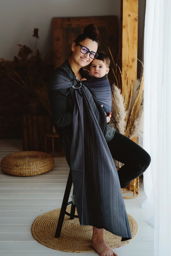 TAGI: noszenie dziecka, noszenie w chuście kółkowej, chusta kółkowa, chusta kółkowa dla niemowlaka, wyprawka dla noworodka, prezent dla noworodka, szara chusta kółkowa, chusta ze splotem skośno-krzyżowym, splot skośno-krzyżowy, chusta tkana, chusta wiązana