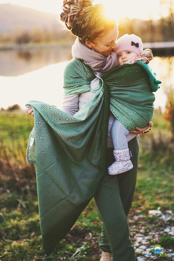 TAGS: portabebés, canastilla recién nacido, regalo bebé recién nacido, regalo baby shower, bandolera de anillas verda, bandolera de anillas jacquard, fular anillas bebé, tejido jacquard, primer fular anillas, fular portabebés