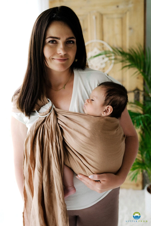 La Bandolera de anillas Pure Linen Almond con tejido canvas fabricada con lino 100% natural. La bandolera de lino es extremadamente transpirable y duradera, y tiene propiedades antifúngicas y antialérgicas. Las bandoleras de anillas se colocan rápidamente, lo que las hace accesibles a todos los padres. Basta con pasar la tela por las anillas cosidas siguiendo las instrucciones, apretarla como corresponda y ¡listo! Cuando están plegadas, las bandoleras de anillas ocupan poco espacio, por lo que son fáciles de transportar y guardar, lo que es importante, especialmente cuando se viaja.