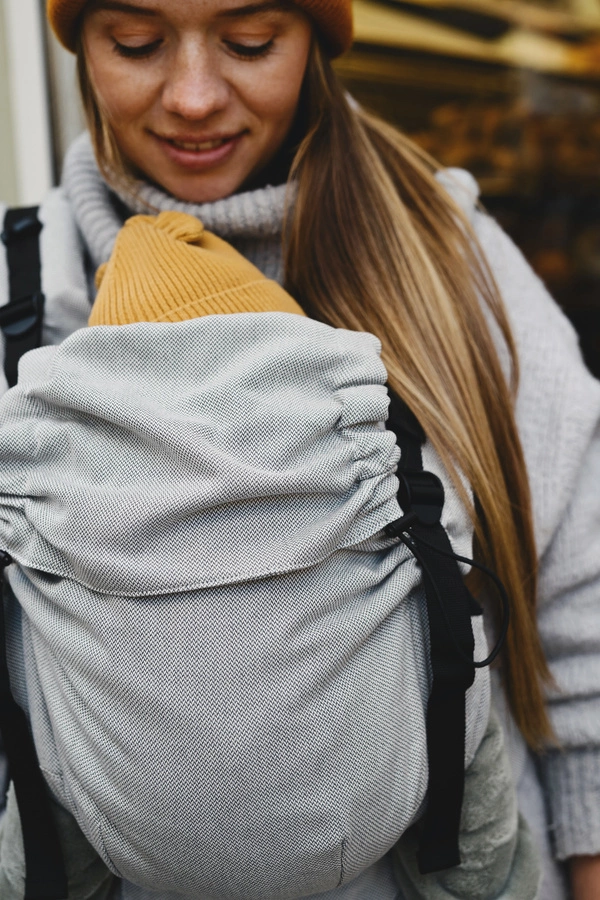 - El portabebés tiene una capucha extraíble, ideal para sujetar la cabeza del bebé mientras duerme. Se abrocha con un broche de presión, por lo que puedes ponerla y quitarla rápidamente.